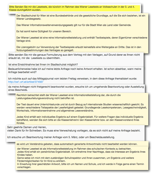 “Bitte haben Sie Verständnis, dass es mir als Verfechter von Informationsfreiheit und Bürgerrechten widerstrebt, mich mit unbefriedigenden Antworten einfach abzufinden. Der Hintergrund meiner Anfrage ist einfach Interesse am Inhalt und da ja tausenden Lehrer und Schüler den Test kennen, war ich einigermaßen irritiert, dass Sie ihn nicht einfach übermitteln konnten.”