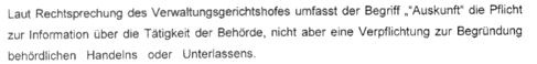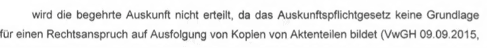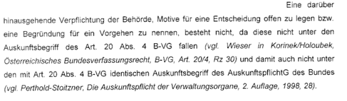 Das Dokument wurde mir nicht zugespielt. Wenn eine Behörde eine Auskunft verweigert, kann man diese Verweigerung in Bescheidform ausführen lassen. Nur gegen diesen Bescheid sind Rechtsmittel möglich, in ihm wird (theoretisch) juristisch argumentiert, warum die Auskunft nicht möglich war. Es gibt außerdem einen Akt zur Erstellung des Bescheids, in den man als Antragsteller Einsicht nehmen kann.