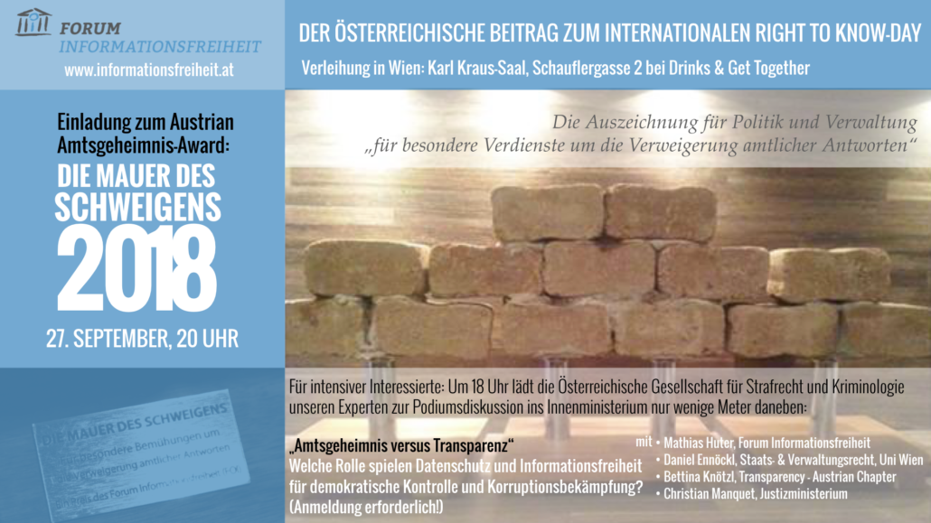 Anlässlich des Internationalen Tags der Informationsfreiheit – dem „International Right to Know Day”, der von Transparenz-Aktivisten und der UNESCO am 28. September 2018 gefeiert wird – verleihen wir dieses Jahr wieder den Amtsgeheimnis-Award „Die Mauer des Schweigens”.