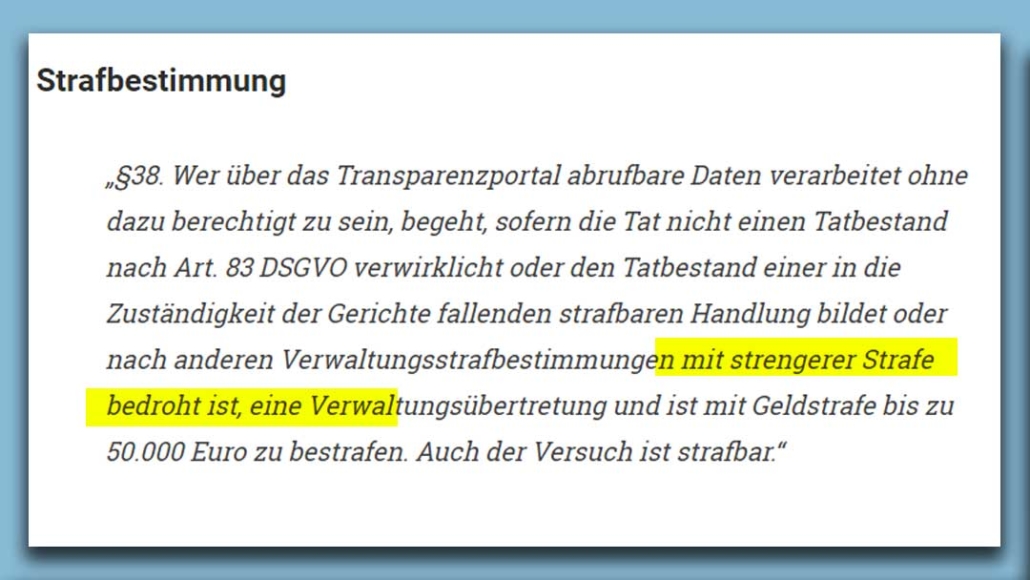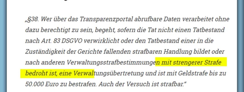 „§38. Wer über das Transparenzportal abrufbare Daten verarbeitet ohne dazu berechtigt zu sein, begeht, sofern die Tat nicht einen Tatbestand nach Art. 83 DSGVO verwirklicht oder den Tatbestand einer in die Zuständigkeit der Gerichte fallenden strafbaren Handlung bildet oder nach anderen Verwaltungsstrafbestimmungen mit strengerer Strafe bedroht ist, eine Verwaltungsübertretung und ist mit Geldstrafe bis zu 50.000 Euro zu bestrafen. Auch der Versuch ist strafbar.“