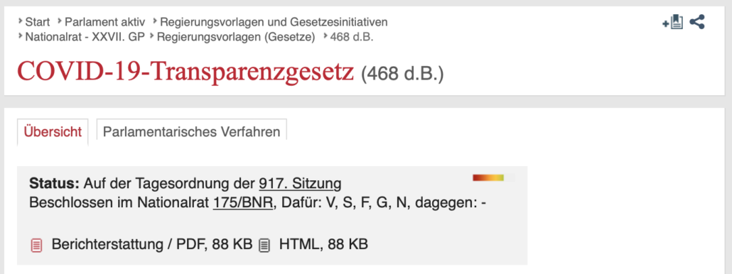 Die Bestimmungen des Gesetzes, das den Namen COVID-19-Transparenzgesetz nicht wert ist, enthalten hauptsächlich Berichtspflichten von Behörden gegenüber Ausschüssen des Parlaments. Diese Ausschüsse tagen üblicherweise hinter verschlossenen Türen. Großteils ändert das Gesetz, welche Ministerien welchen Ausschüssen zu berichten haben. Möglicherweise werden auch die Kontrollrechte des Parlaments gestärkt – beispielsweise durch die Einführung monatlicher Berichtspflichten. Die Kontrollrechte des Parlaments sind ein wichtiges Gut – sie haben jedoch nichts mit Transparenz, wie wir sie verstehen, zu tun.