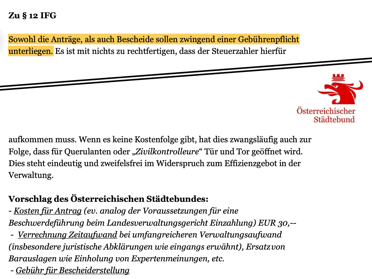 Laut Städtebund sollen zum Beispiel der Antrag, ein Bescheid (der benötigt wird, um z.B. Informationsverweigerungen juristisch anzufechten) als auch der „Zeitaufwand bei umfangreicherem Verwaltungsaufwand, Ersatz von Barauslagen wie Einholung von Expertenmeinungen, etc.“ den Antragsteller:innen etwas kosten.