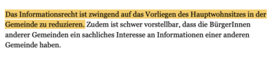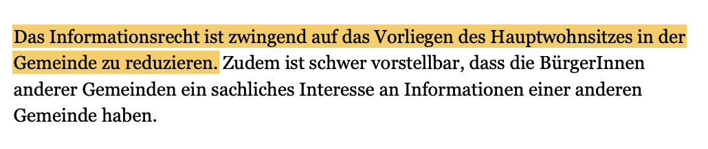 Laut dem Österreichischen Städtebund sollen Behörden bei Anfragen die Antragsteller:innen nicht nur auffordern können, ihr Auskunftsinteresse zu begründen, sondern „auf Verlangen glaubhaft zu machen“. Was als „glaubhaft“ definiert wird und ab wann eine Anfrage glaubhaft genug ist, bleibt offen. Ginge es nach dem Städtebund wäre das Recht auf Information sogar auf den jeweiligen Hauptwohnsitz begrenzt. Sie sind nicht in der Gemeinde gemeldet, welche die Informationen hat, die Sie interessieren? Oder haben vielleicht nur einen Nebenwohnsitz? Schlecht für Sie: „Das Informationsrecht ist zwingend auf das Vorliegen des Hauptwohnsitzes in der Gemeinde zu reduzieren. Zudem ist schwer vorstellbar, dass die BürgerInnen anderer Gemeinden ein sachliches Interesse an Informationen einer anderen Gemeinde haben.“