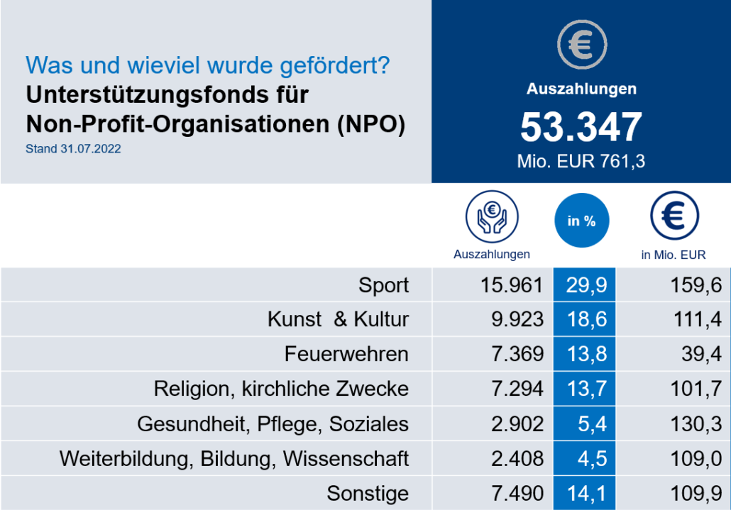 Der NPO-Fonds wurde von der Bundesregierung aufgesetzt, um „gemeinnützige Organisationen aus allen Lebensbereichen, vom Sozialbereich über Kultur bis zum Sport, freiwilligen Feuerwehren oder gesetzlich anerkannten Religionsgemeinschaften“ mit Zuschüssen in der Covid-Krise zu unterstützen.