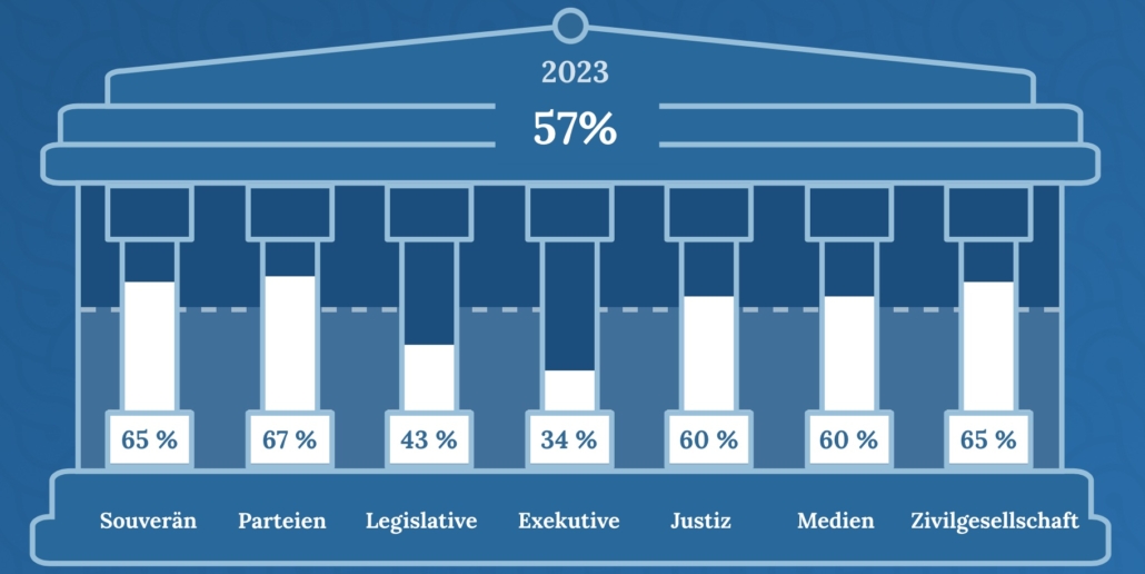 Verbesserungen gab es in den Säulen Parteien, Justiz, Zivilgesellschaft und Wahlen, insgesamt verschlechterte sich der Wert des Demokratie-Index 2023 um 0,1 Prozentpunkte auf 57,0%.