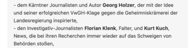 „für die schikanöse Behandlung einer Journalisten-Anfrage, inklusive Androhung einer Mutwilligkeitsstrafe und Inserate-Entzug“