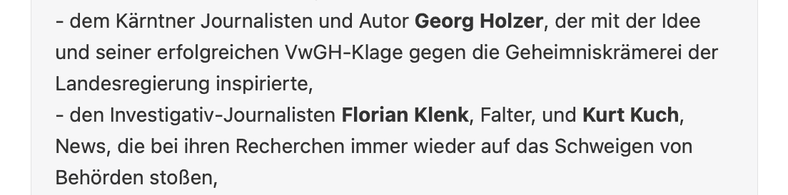 Der Amtsgeheimnis-Award „Mauer des Schweigens“, den wir auch seit einigen Jahren jährlich vergeben, wird breit wahrgenommen – wobei ich mich bei manchen Anfragen, bei besonders abenteuerlichen Begründungen, schon frage, ob sich die Behörde durch den Award inspirieren hat lassen.